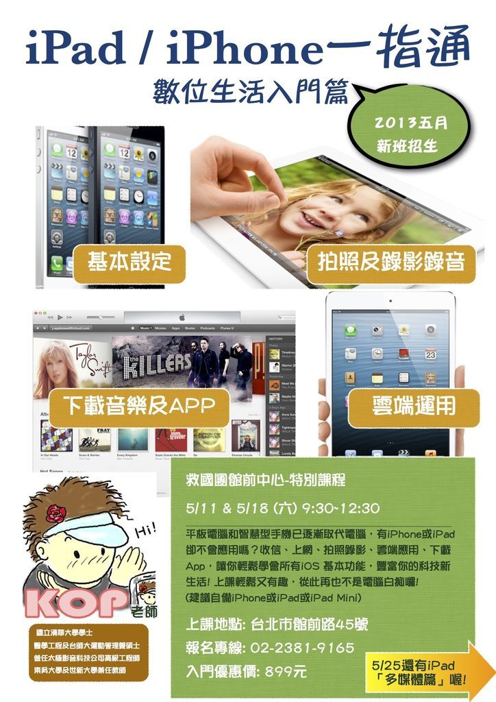 Kop老師五月份在救國團館前中心開的iPad教學課程,還是會先開入門篇,5/11開課。